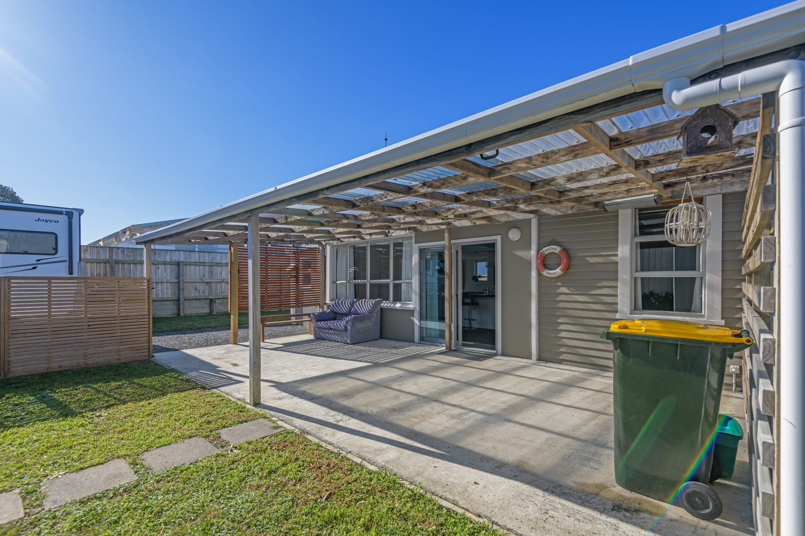 Inside, the home features a modern open-plan kitchen and living area, filled with natural light and designed for comfort. The vibrant bathroom/laundry combo gives off beach bach vibes — a fun and functional space that adds personality to the home.