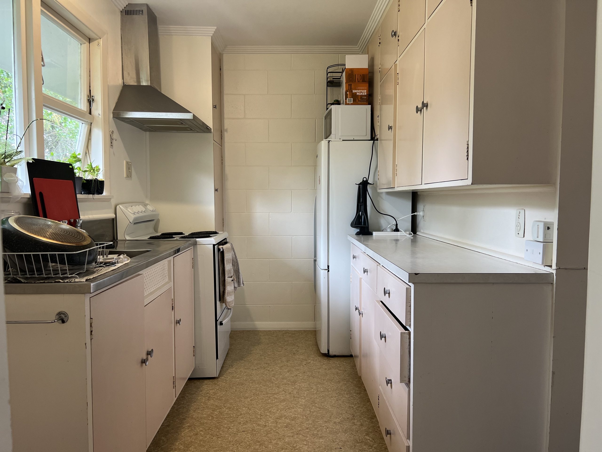 -Kitchen with oven, rangehood and plenty of cupboard space.